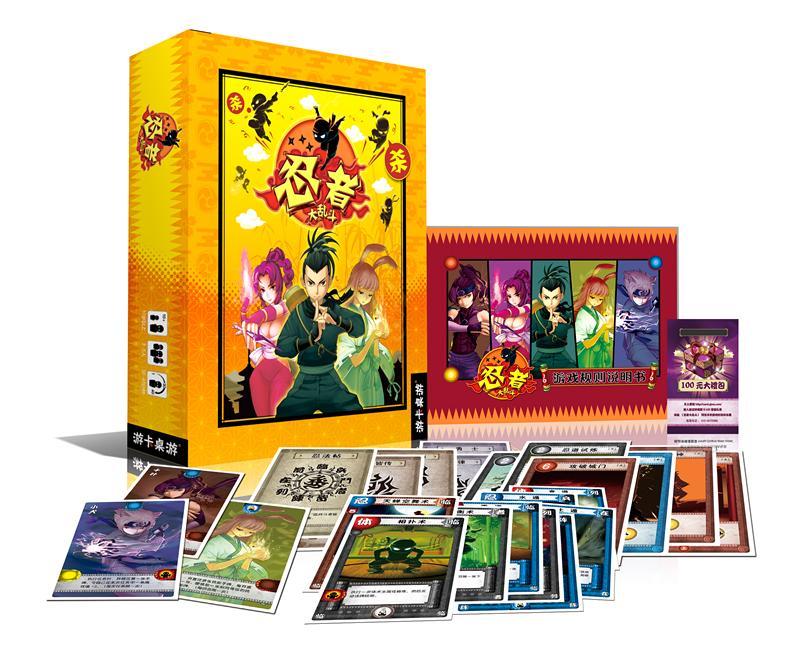 每盒《忍者大亂斗》,包含技能牌75張、任務牌24張、忍具牌18張、成就牌11張、人物牌5張、參考卡5張、共138張游戲牌,另附說明書1份、刮刮卡1張??ㄅ飘嫻ぜ毮?,并采用高檔藍芯紙制作,零售價39元。