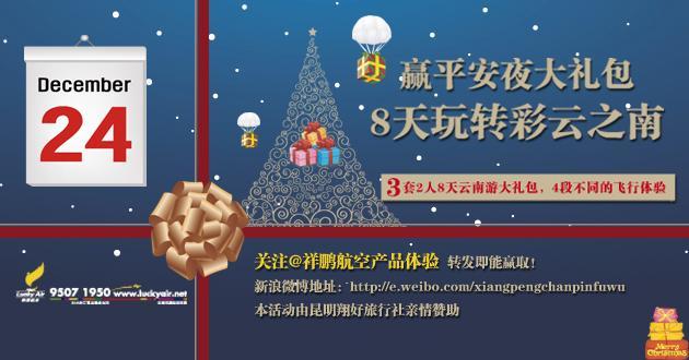 昆明2012年12月4日電 /美通社/ -- 參與微博活動,隨手轉(zhuǎn)發(fā)即可獲得8天云南旅游大禮包。12月3日開始,云南祥鵬航空注冊于新浪的航空產(chǎn)品專屬微博@祥鵬航空產(chǎn)品體驗 將再次舉辦惠民活動。聯(lián)合昆明翔好旅行社,本次微博活動的禮品會把飛行與旅行體驗結(jié)合在一起,送出3套2人8天7夜的云南旅行大禮包,其中包含4段飛行過程。而擁有獲得上述禮物的機(jī)會,僅需登陸微博參與@祥鵬航空產(chǎn)品體驗 的微博轉(zhuǎn)發(fā)活動即可?;顒訒r間截止12月24日,大禮將于平安之夜發(fā)放。