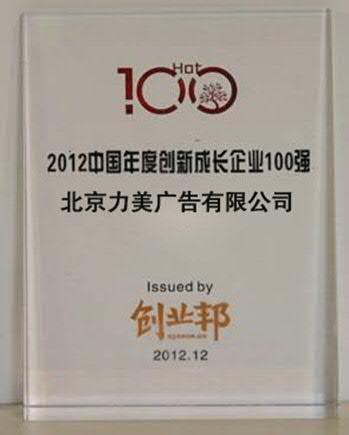 北京2012年12月10日電 /美通社/ -- 近日,由創(chuàng)業(yè)邦 (cyzone.cn) 主辦的“2012創(chuàng)業(yè)邦年會(huì)暨‘創(chuàng)業(yè)邦100’年度頒獎(jiǎng)典禮”在北京千禧大酒店隆重舉行。本屆年會(huì)以“夢(mèng)想照亮現(xiàn)實(shí)”為主題。經(jīng)過(guò)激烈的角逐與多方評(píng)估、審核,國(guó)內(nèi)領(lǐng)先的移動(dòng)營(yíng)銷解決方案提供商 -- 力美廣告?zhèn)髅?/a>,憑借其創(chuàng)新且領(lǐng)先的綜合實(shí)力,喜獲“創(chuàng)新成長(zhǎng)企業(yè)100強(qiáng)”稱號(hào)。