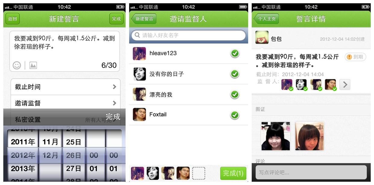 其次《誓友》的iOS版加入了“監(jiān)督”“發(fā)圖證”等創(chuàng)新互動(dòng)元素,這是目前市場(chǎng)上其他社交應(yīng)用所不具備的功能,這種創(chuàng)新互動(dòng)不但促進(jìn)了用戶和好友間的溝通交流,還有效的幫助用戶監(jiān)督完成他們的誓言。