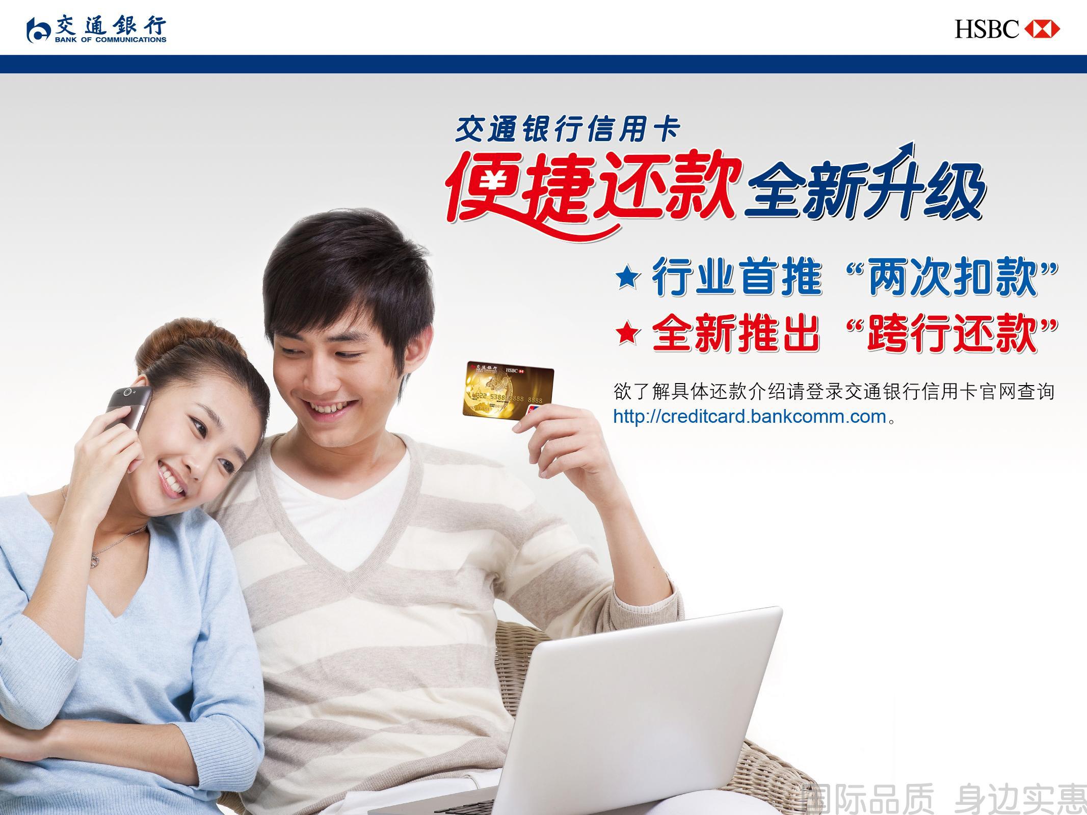 上海2012年12月24日電 /美通社/ -- 服務(wù)無(wú)止境,體驗(yàn)無(wú)上限,交通銀行信用卡一直致力于為持卡人提供便利、快捷的還款服務(wù)。最近,交通銀行信用卡在業(yè)內(nèi)首創(chuàng)信用卡還款“兩次扣款”功能,并為持卡人提供跨行還款服務(wù),還款服務(wù)全面升級(jí),讓持卡人還款更便利、更快捷、更省心。