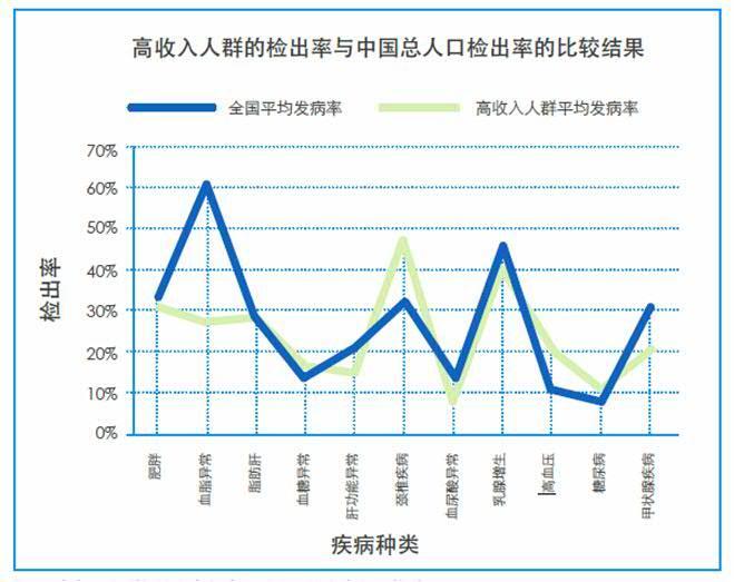 中國(guó)高收入人群的平均檢出率與中國(guó)總?cè)丝谄骄鶛z出率的比較結(jié)果為肥胖、血脂異常、肝功能異常、血尿酸異常、乳腺增生、甲狀腺疾病的檢出率均高于中國(guó)全人口檢出率。而脂肪肝、血糖異常、糖尿病的檢出率接近中國(guó)全人口檢出率。此外高血壓、頸椎病的檢出率則低于中國(guó)全人口檢出率。