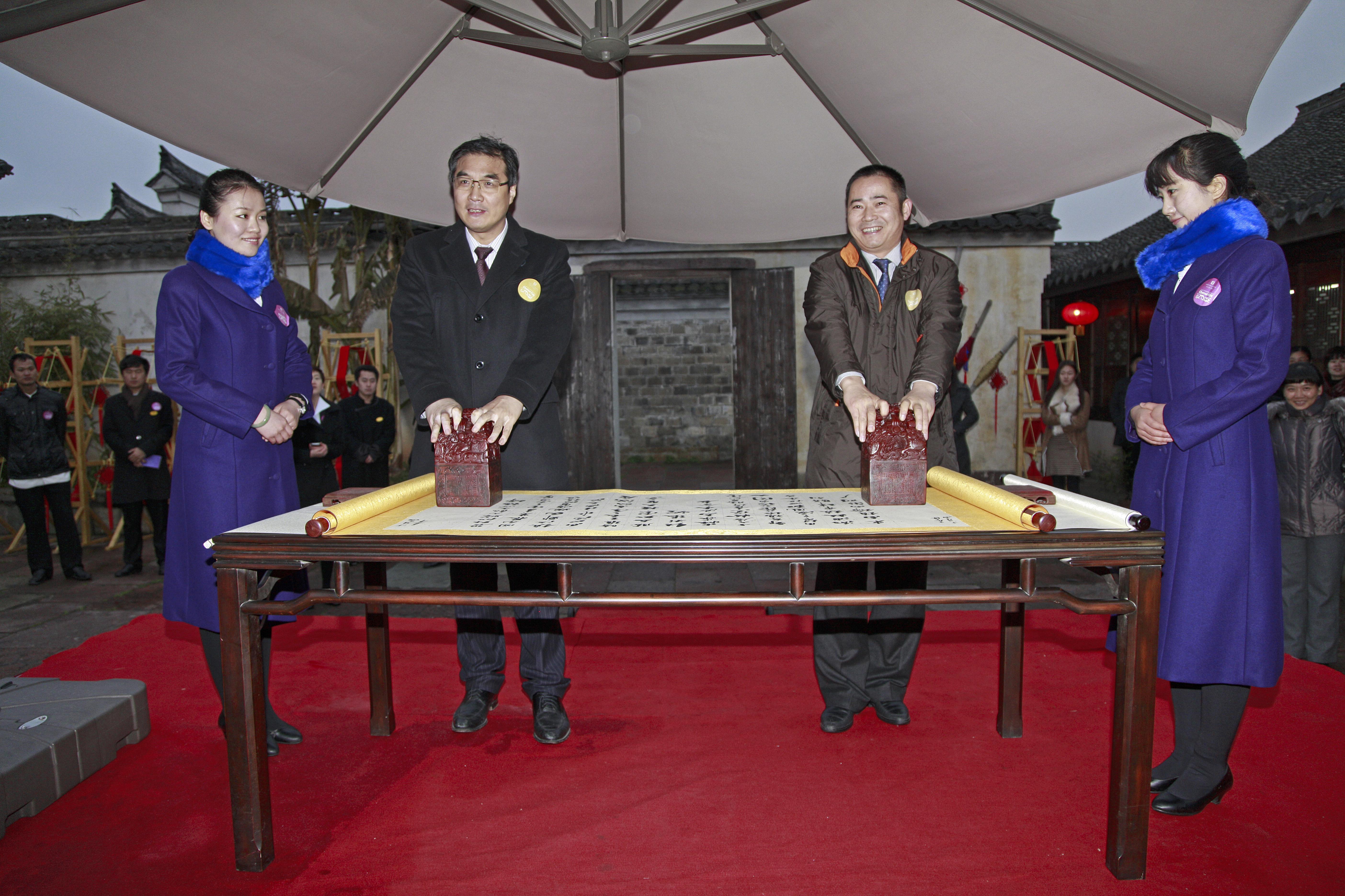 鎮(zhèn)海區(qū)副區(qū)長(zhǎng)王兆波和開元旅業(yè)集團(tuán)總裁陳燦榮分別代表各方在現(xiàn)場(chǎng)簽了約。最后,鎮(zhèn)海區(qū)委書記薛維海和開元旅業(yè)集團(tuán)董事長(zhǎng)陳妙林一起走上龍鳳臺(tái),為掛在臺(tái)梁柱上的大紅綢結(jié)彩,寓示兩家成功“聯(lián)姻”。