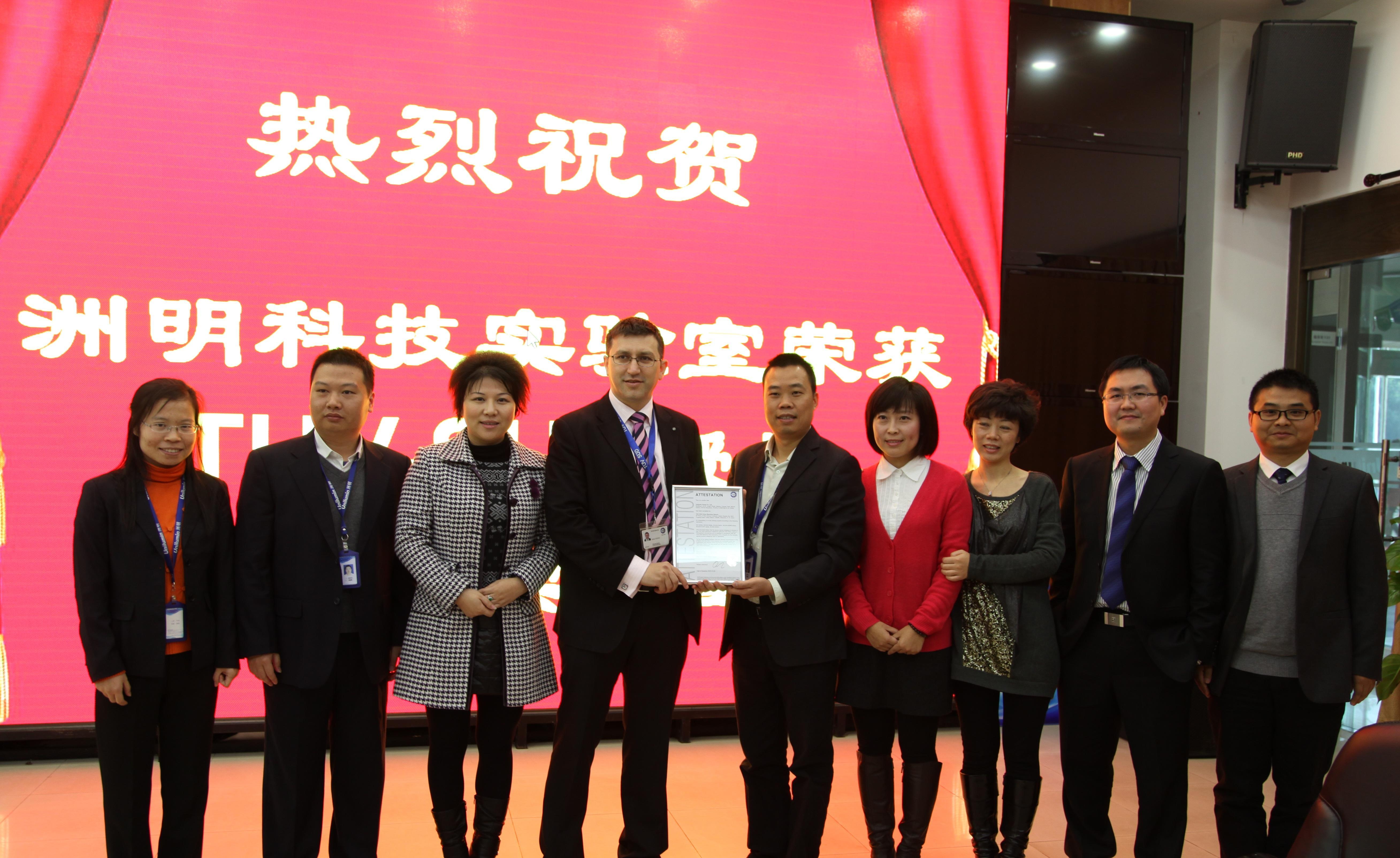北京2013年1月7日電 /美通社/ -- 2013年1月5日,TUV南德意志集團(tuán)(以下簡稱TUV SUD)為深圳市洲明科技股份有限公司(以下簡稱洲明科技)頒發(fā)了目擊測試授權(quán)證書,成為了中國獲得 TUV SUD認(rèn)可的照明企業(yè)實(shí)驗(yàn)室。TUV SUD 南中國區(qū)電磁兼容部經(jīng)理 Radu Gosav 先生和 TUV SUD 南中國區(qū)照明產(chǎn)品部經(jīng)理唐杰先生向洲明科技董事長林洺鋒先生頒發(fā)了證書。