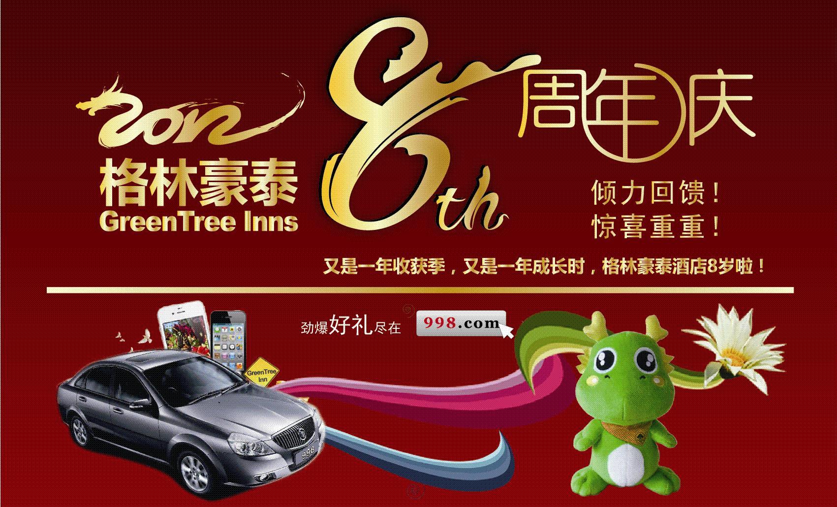 上海2013年1月8日電 /美通社/ -- 格林豪泰酒店管理集團(tuán)(以下簡(jiǎn)稱“格林豪泰”)慶祝公司成立八周年,為感謝廣大客人多年來(lái)的關(guān)注與支持,推出“百萬(wàn)豪禮感恩反饋”活動(dòng),最后特等獎(jiǎng) -- 價(jià)值十萬(wàn)余元的轎車將于2013年1月份擇日抽取。