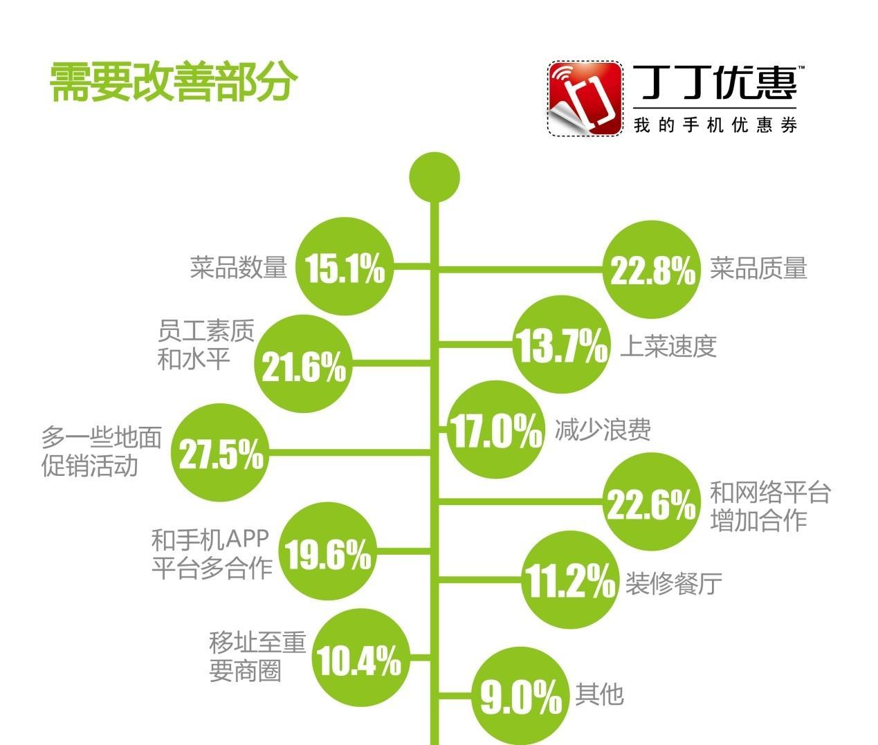 改革開放34年來,餐飲業(yè)經(jīng)歷了摸索、自發(fā)、無序、競爭發(fā)展,存在諸多發(fā)展中不可規(guī)避的問題,但是目前仍然是一批大型連鎖餐飲企業(yè)結(jié)合并借鑒國際化先進管理經(jīng)驗,帶領(lǐng)中國餐飲企業(yè)走向有序、多形態(tài)并存的餐飲生態(tài)圈,而這種以少數(shù)先進帶動大基數(shù)中小型餐飲企業(yè)有序競爭發(fā)展,需要餐飲行業(yè)協(xié)會及有關(guān)部門給予可持續(xù)的可操作性的指導,需要強有力的導師團隊進行面對面的、點對點的服務(wù)指導。同時一批中間服務(wù)平臺也顯得尤為重要,比如丁丁優(yōu)惠這樣的手機 APP 平臺去幫助餐飲商戶營銷,解決商戶短板問題。當然,餐飲業(yè)管理者自我提升更為關(guān)鍵。