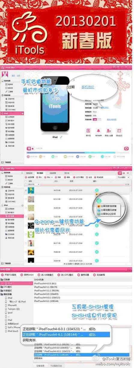 深圳2013年2月4日電 /美通社/ -- 春節(jié)快來了,四處洋溢著濃厚的過節(jié)氣氛,iOS6.1也趕上春節(jié)的浪潮乘勢發(fā)布,惹得我們內(nèi)心都蠢蠢欲動了。 iTools 推出 20130131 新春正式版,全面支持最新 iOS6.1 管理和 iOS6.1 的 SHSH 備份,特色新春版界面,節(jié)日氣氛更濃郁;程序庫加倍優(yōu)化,管理更高效,更有手機估值、Q-Zone分享和農(nóng)歷一鍵添加等特色功能,讓你的蘋果變簡單。