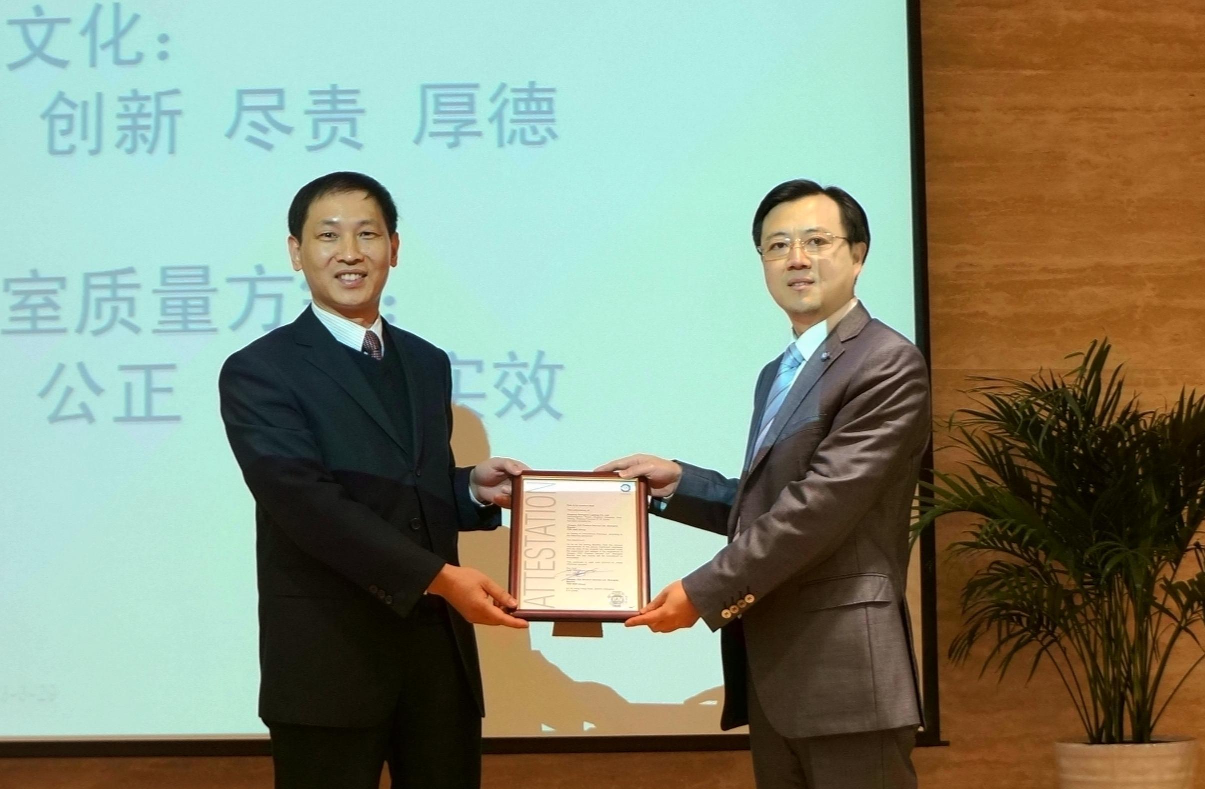 嘉興2012年4月1日電 /美通社/ -- 2013年3月29日,TUV 南德意志集團(tuán)(以下簡稱“TUV SUD”)為浙江生輝照明有限公司頒發(fā)了LED光源合作實(shí)驗(yàn)室授權(quán)證書,使其成為長三角地區(qū)首個(gè)獲得TUV SUD此類證書的照明企業(yè)實(shí)驗(yàn)室。經(jīng)過1年多的時(shí)間,生輝照明通過了TUV SUD嚴(yán)苛的審核,終于獲得此項(xiàng)證書,證明生輝照明在設(shè)備計(jì)量、流程規(guī)范、人員培訓(xùn)、環(huán)境控制、數(shù)據(jù)對(duì)比、文件完善、數(shù)據(jù)記錄與管理等各個(gè)方面符合測量體系要求。TUV南德意志大中華集團(tuán)高級(jí)副總裁 & 中區(qū)董事總經(jīng)理金燦先生向浙江生輝照明有限公司常務(wù)副總經(jīng)理陸光明先生頒發(fā)了證書。從2006年至今,TUV SUD已經(jīng)為生輝照明頒發(fā)了數(shù)百張證書。