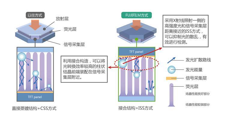 用于一般間接變化型FPD的CSS(Conventional Side Sampling,即傳統(tǒng)的透過側(cè)采集)方式中,X射線照射部位設(shè)置熒光層,發(fā)射部位設(shè)置信號(hào)采集層 (TFT panel)。CSS方式下,X射線發(fā)射部位發(fā)出的高強(qiáng)度光在到達(dá)信號(hào)采集層的過程中,容易發(fā)生衰減和散亂,使X射線信息損失較大。另一方面,在富士膠片獨(dú)有的“ISS技術(shù)”中,在X射線照射部位設(shè)置信號(hào)采集層,縮短了X射線在到達(dá)信號(hào)采集層之前經(jīng)過的的距離,從而可以有效接收X射線檢測(cè)出發(fā)出的光。此外,沒有采用將CsI柱狀結(jié)晶之直接蒸鍍于信號(hào)采集層,形成CsI柱狀結(jié)晶的一般“直接蒸鍍結(jié)構(gòu)”,而是采用了光轉(zhuǎn)換效率高,結(jié)晶性能優(yōu)越的CsI柱狀結(jié)晶先頭部分和信號(hào)采集層貼合的“接合結(jié)構(gòu)”,從而使高畫質(zhì)化成為可能。(請(qǐng)參考圖1)