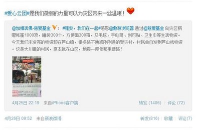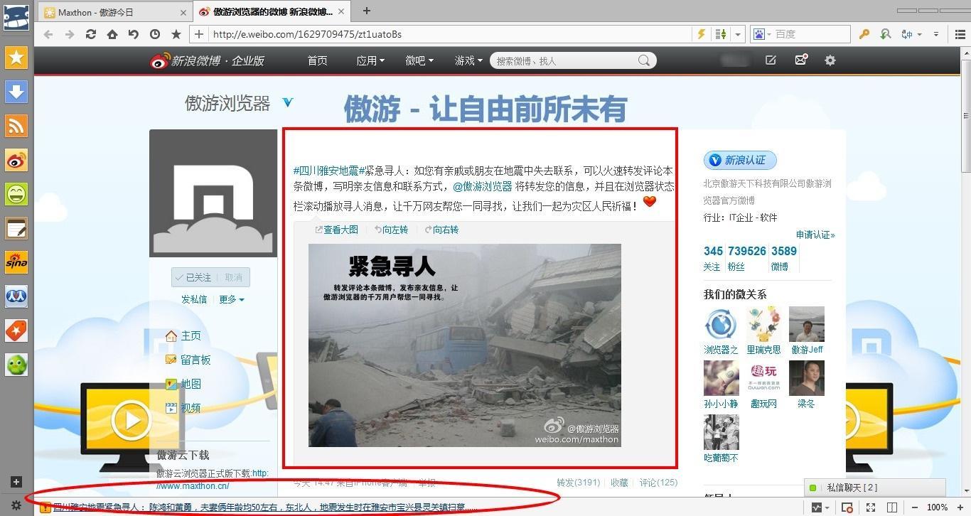 同時,傲游還及時推出“雅安地震尋人”的微博公益活動,災(zāi)區(qū)群眾可以關(guān)注傲游云瀏覽器新浪官方微博,通過回復(fù),進(jìn)行人工求助和尋找親人等。關(guān)心災(zāi)區(qū)傲游用戶,還可以通過關(guān)注傲游云瀏覽器的官方微博了解更多災(zāi)區(qū)情況。