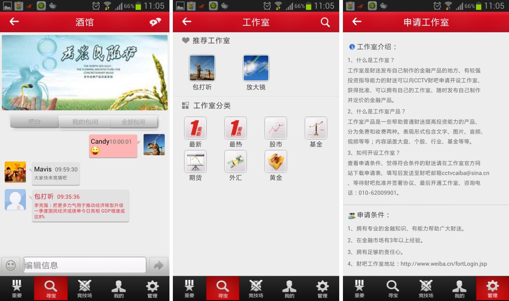CCTV證券資訊頻道具有豐富的股市、基金、外匯、期貨、貴金屬等理財產品的資訊信息,同時擁有一支專業(yè)的證券行業(yè)專家隊伍。這些專家已陸續(xù)在“財吧”中開設專屬工作室,實時上傳相關的投資分析等資訊信息。