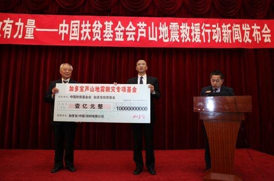在突如其來的地震發(fā)生后,加多寶集團立即通過當地銷售公司人員實時關注災情狀況,并第一時間緊急調集1000箱加多寶涼茶與1000箱昆侖山礦泉水奔赴災區(qū),24日又調集2000箱加多寶涼茶,緩解了災區(qū)用水的燃眉之急。于26日在中國扶貧基金會主辦的“有你救有力量-四川蘆山地震救援行動”新聞發(fā)布會宣布再捐1億給雅安地區(qū),用于賑災和災后重建工作。國務院扶貧辦副主任鄭文凱、中國扶貧基金會會長段應碧、四川省人民政府副秘書長兼駐京辦主任陳貴華等領導人作為代表接受了企業(yè)捐贈。除此之外,加多寶員工也紛紛慷慨解囊,自發(fā)捐款58萬元支援災區(qū)重建。