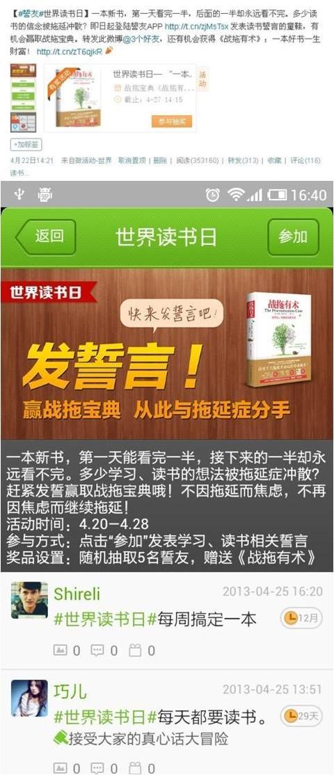 4月23日,《誓友》在手機(jī)平臺(tái)和官方微博雙雙推出“讀書日戰(zhàn)拖”主題線上活動(dòng)http://event.weibo.com/824246 ,獎(jiǎng)品是由含章行文提供的《戰(zhàn)拖有術(shù)》,得到了廣大網(wǎng)友的熱情參與,截止活動(dòng)結(jié)束時(shí),微博活動(dòng)閱讀參與突破36萬(wàn)次。