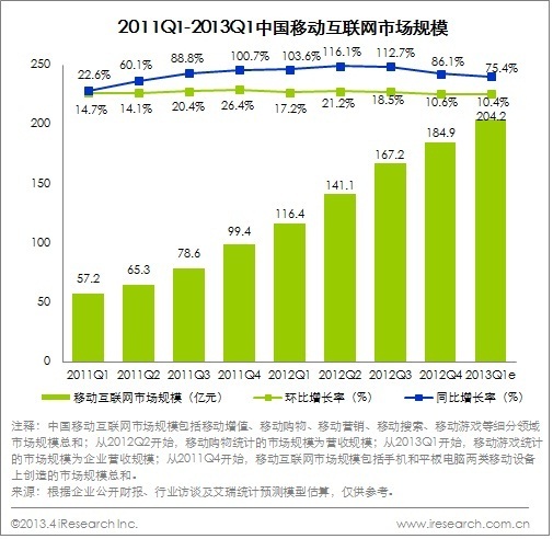 2013Q1由于假期的影響,移動互聯(lián)網(wǎng)整體增速有所降低,但是移動互聯(lián)網(wǎng)經(jīng)過2011-2012年的高速發(fā)展已經(jīng)到了關(guān)鍵性的一年。