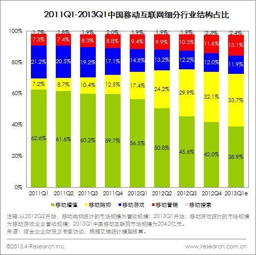 2013Q1 由于是網(wǎng)購的淡季,移動購物在整體市場中的占比增幅較小,然而移動購物的市場依然保持了較高增長;移動增值雖然仍是移動互聯(lián)網(wǎng)占比較高的細(xì)分行業(yè),但其占比持續(xù)下降,傳統(tǒng)的增值業(yè)務(wù)不斷被其他領(lǐng)域擠壓,新興增值業(yè)務(wù)體量尚?。灰苿佑螒蛟鏊佥^為平穩(wěn),在其他領(lǐng)域增速較高的背景下市場份額也處于下降趨勢;而新興的移動搜索及移動營銷基數(shù)較小,增速較高,占比也處于快速增長狀態(tài)。艾瑞預(yù)計未來移動購物將成為移動互聯(lián)網(wǎng)較大細(xì)分行業(yè)。