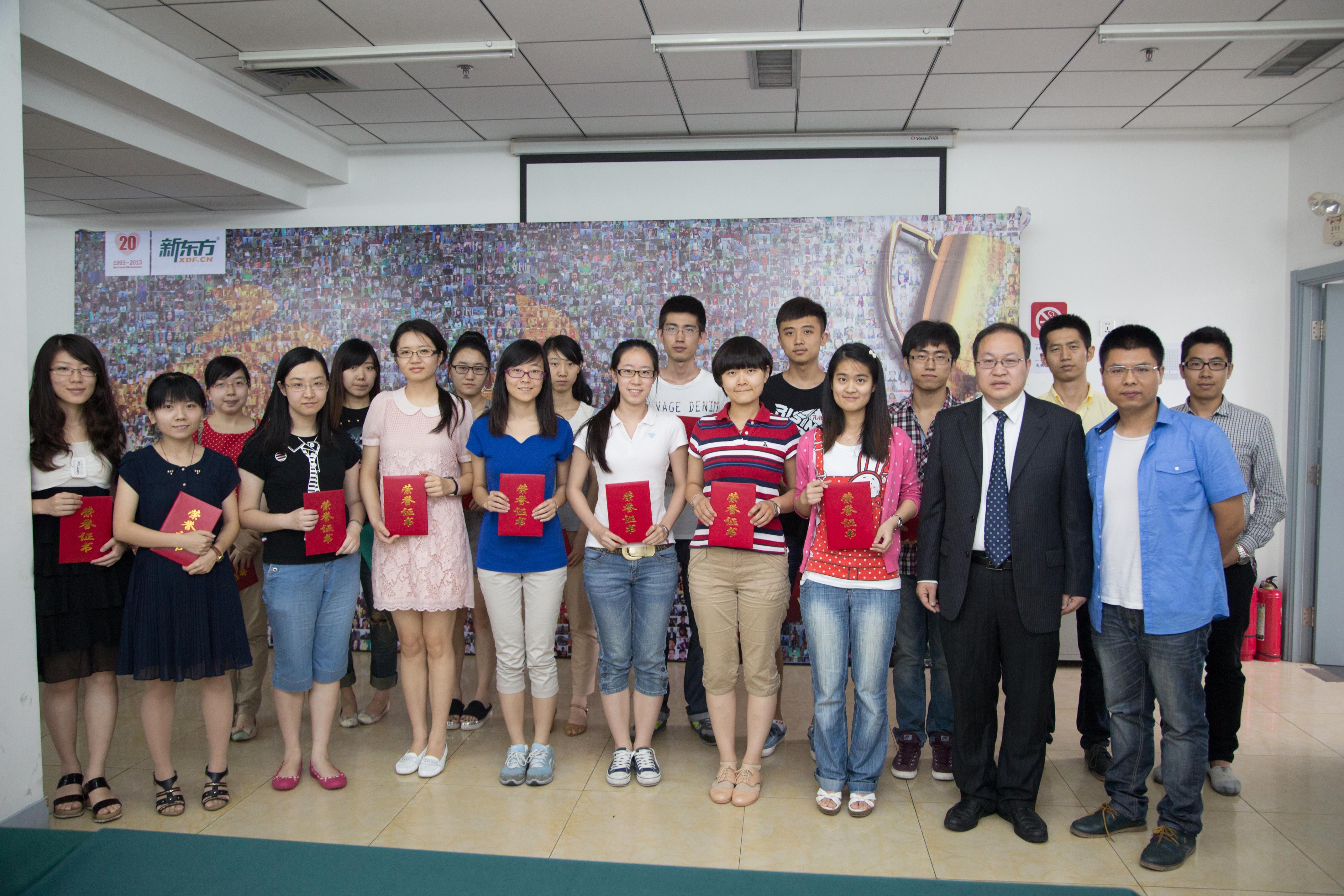 2013年6月22日,新東方北京學(xué)校舉辦“綻放榜樣的力量” -- 新東方北京學(xué)校2013年優(yōu)秀學(xué)員頒獎(jiǎng)典禮,為417名高分學(xué)員頒發(fā)獎(jiǎng)學(xué)金。出國(guó)留學(xué)、考研、四六級(jí)、高級(jí)同傳、翻譯等二十多個(gè)項(xiàng)目領(lǐng)域的“學(xué)霸牛人”,齊聚一堂共同分享自己的學(xué)習(xí)經(jīng)驗(yàn)與奮斗成果。新東方教育科技集團(tuán)副總裁兼新東方北京學(xué)校校長(zhǎng)汪海濤,攜眾多名師親臨現(xiàn)場(chǎng),鄭重為獲獎(jiǎng)學(xué)員頒發(fā)代表著巨大榮譽(yù)的“新東方獎(jiǎng)學(xué)金”。