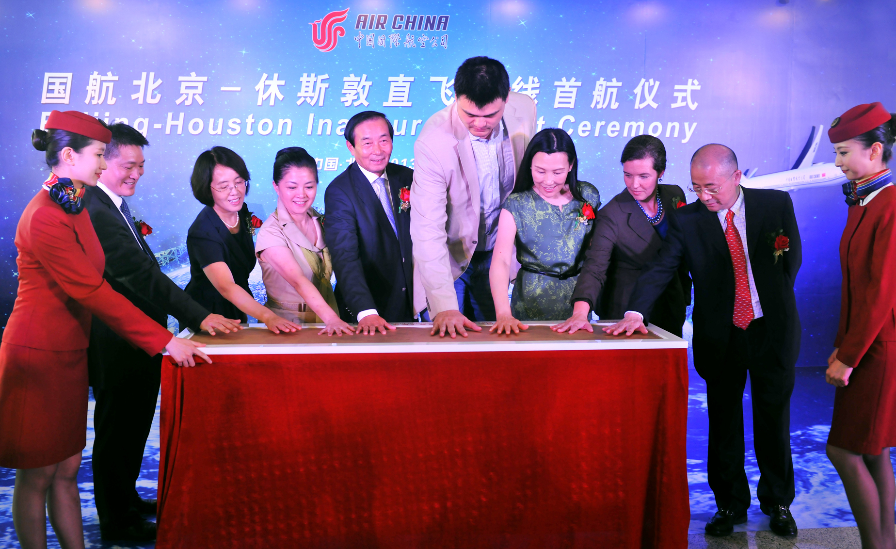北京2013年7月12日電 /美通社/ -- 2013年7月11日13時,中國國際航空股份有限公司(以下簡稱“國航”)北京-休斯敦直飛航線首航儀式在首都機(jī)場3號航站樓舉行。中國民用航空局副局長夏興華、中國駐休斯敦總領(lǐng)事許爾文、美國駐中國大使館參贊孫曉雅(Sandra Oudkirk)、中國航空集團(tuán)黨組書記王銀香、國航黨委書記樊澄、副總裁王明遠(yuǎn)、北京首都國際機(jī)場股份有限公司黨委書記李小梅以及休斯敦親善大使、前休斯敦火箭隊籃球巨星姚明應(yīng)邀出席首航儀式。