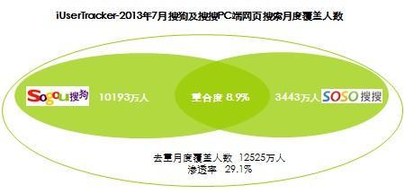 第一,從流量層面來看,二者在PC端與移動端存在良好互補(bǔ)作用。在PC端,搜狗流量份額居于第三,搜搜也具有一定的流量規(guī)模,且二者的用戶重合度較小,具有較強(qiáng)的互補(bǔ)作用。根據(jù)流量監(jiān)測工具iUserTracker的數(shù)據(jù)顯示,2013年7月PC端搜狗及搜搜的月度覆蓋人數(shù)重合度僅為8.9%,去重滲透率接近30%。在移動端,搜狗的布局相對較少,但搜搜在移動端耕耘多時,當(dāng)前已獲取較高的流量份額。搜狗與搜搜融合后在PC端和移動端的競爭力都將得到加強(qiáng)。