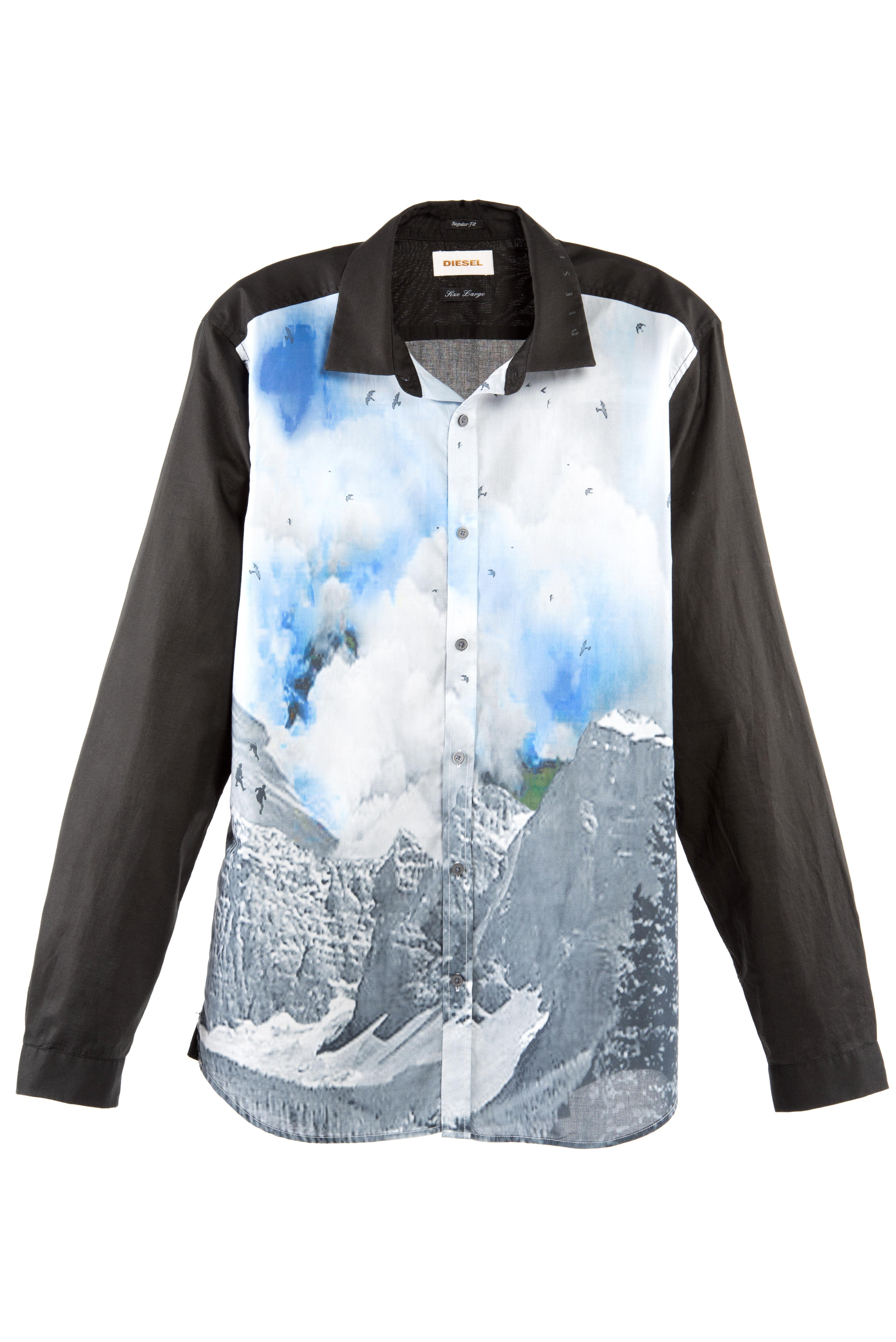 此款印花襯衫的靈感來(lái)自于迷彩。設(shè)計(jì)師采用特殊工藝將該系列襯衫處理成為移動(dòng)的畫布,用照片和圖案在上面描繪出洛杉磯市郊的生活 -- 黑色作為主基調(diào)與藍(lán)紫色的煙云印花形成強(qiáng)烈對(duì)比,有如點(diǎn)綴在夜空中的閃亮繁星,大膽的圖案運(yùn)用與吞噬等處理手法無(wú)不體現(xiàn)搖滾精神,彰顯DIESEL不羈自我的品牌精神。
