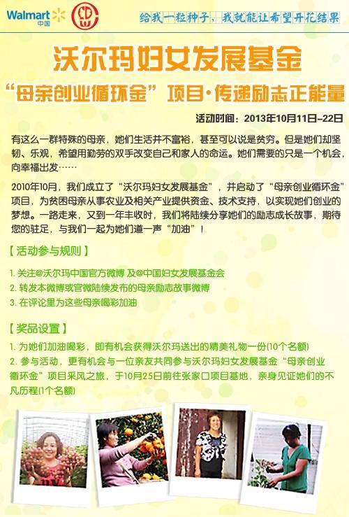 2010年,沃爾瑪與中國婦女發(fā)展基金會在北京簽署諒解備忘錄,并捐贈100萬元人民幣,作為啟動資金成立“沃爾瑪婦女發(fā)展基金”。這筆資金捐贈中國婦女發(fā)展基金會所領(lǐng)導(dǎo)的“母親創(chuàng)業(yè)循環(huán)金”項(xiàng)目,致力于全面支持中國農(nóng)村女性發(fā)展,以“入戶扶貧,循環(huán)使用”的方式,為中國貧困地區(qū)女性從事農(nóng)業(yè)及相關(guān)產(chǎn)業(yè)提供資金、技術(shù)支持,幫助實(shí)現(xiàn)貧困婦女創(chuàng)業(yè)。而此次“為創(chuàng)業(yè)母親喝彩,傳播勵志正能量”主題線上活動,集中展示了沃爾瑪“母親創(chuàng)業(yè)循環(huán)金”項(xiàng)目下受助母親創(chuàng)業(yè)的成功典范,包括:“播種新玉米,收獲新希望”的趙文華、“從零開始種葡萄,增收萬元得豐收”的王朵秀、“科技種植,不出去打工也致富”的王紅霞、“戰(zhàn)勝柑桔蟲害,挽回15萬元”的王燦芬和“苗繡掙得救命錢”的麻荷花。沃爾瑪“母親創(chuàng)業(yè)循環(huán)金”項(xiàng)目有效地幫助了貧苦婦女在養(yǎng)殖、種植和手工藝生產(chǎn)方面所面臨的資金不足問題,促進(jìn)了農(nóng)村婦女脫貧致富。自2010年起,該項(xiàng)目實(shí)現(xiàn)滾動投入扶貧創(chuàng)業(yè)資金共計379萬元,三年累計資助1700戶,戶均扶持金額為1500至5000元,使6000余人實(shí)現(xiàn)脫貧致富,間接帶動18000余人實(shí)現(xiàn)就業(yè)。