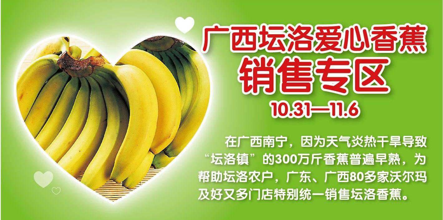 中國(guó)南寧2013年11月4日電 /美通社/ -- 因天氣炎熱干旱,廣西南寧壇洛鎮(zhèn)的300萬(wàn)斤香蕉普遍早熟,使上市高峰提前來(lái)到,熟蕉賤賣卻仍無(wú)人問(wèn)津,蕉農(nóng)損失慘重。沃爾瑪?shù)弥闆r后,迅速與香蕉商會(huì)對(duì)接,收購(gòu)近8.5噸香蕉。10月31日起到11月6日,廣東、廣西80多家門店統(tǒng)一銷售愛(ài)心香蕉,幫助壇洛農(nóng)戶解決燃眉之急。