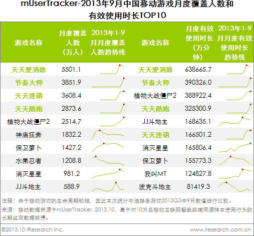 從2013年9月移動(dòng)游戲月度覆蓋人數(shù)和使用時(shí)長(zhǎng)榜單中可以看到,2013Q3成為騰訊移動(dòng)游戲的天下,特別是微信平臺(tái)對(duì)于用戶的吸引巨大,從8月5日《打飛機(jī)》和《天天愛(ài)消除》在微信5.0 iOS平臺(tái)首推,短短兩個(gè)月時(shí)間已經(jīng)占據(jù)用戶覆蓋和使用時(shí)長(zhǎng)前列,社交平臺(tái)本身的用戶黏性及社交屬性對(duì)于輕度游戲用戶的吸引力較強(qiáng)。另外9月Android平臺(tái)首發(fā)的《植物大戰(zhàn)僵尸2》也獲得了大量用戶,并且人均使用時(shí)長(zhǎng)相比其他游戲更高。