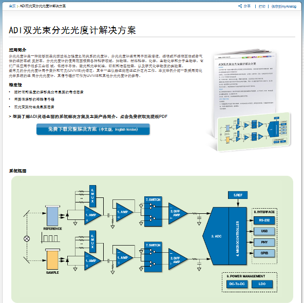 上海2013年11月20日電 /美通社/ -- Analog Devices, Inc.(NASDAQ: ADI),全球領(lǐng)先的高性能信號(hào)處理解決方案供應(yīng)商,近日推出了一款雙光束分光光度計(jì)解決方案。作為ADI當(dāng)月精選方案,這款光度計(jì)憑借低功耗、高精度和極度可靠的穩(wěn)定性,可廣泛適用于科研和工業(yè)領(lǐng)域,為工程師解決該類設(shè)計(jì)難題提供了簡(jiǎn)單高效的解決方案。