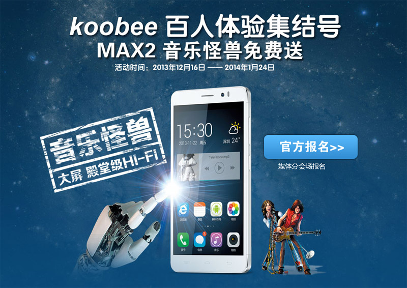 深圳2013年12月19日電 /美通社/ -- 近日koobee官網(wǎng)聯(lián)合四家媒體上線了名為“百人體驗集結(jié)號 MAX2音樂怪獸免費送”的網(wǎng)友免費試用活動,預(yù)示著koobee旗下MAX系列的第二代產(chǎn)品MAX2即將橫空出世。