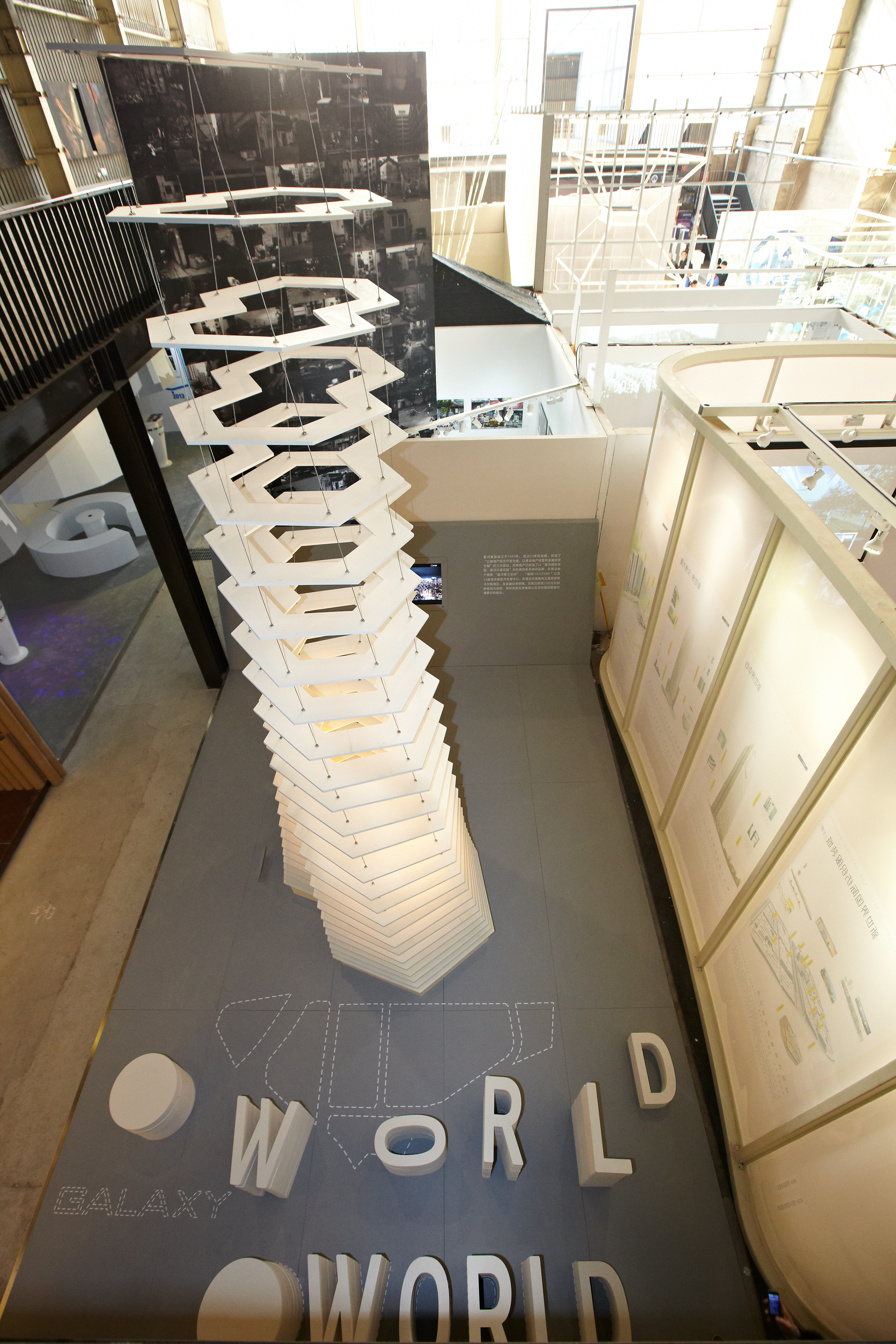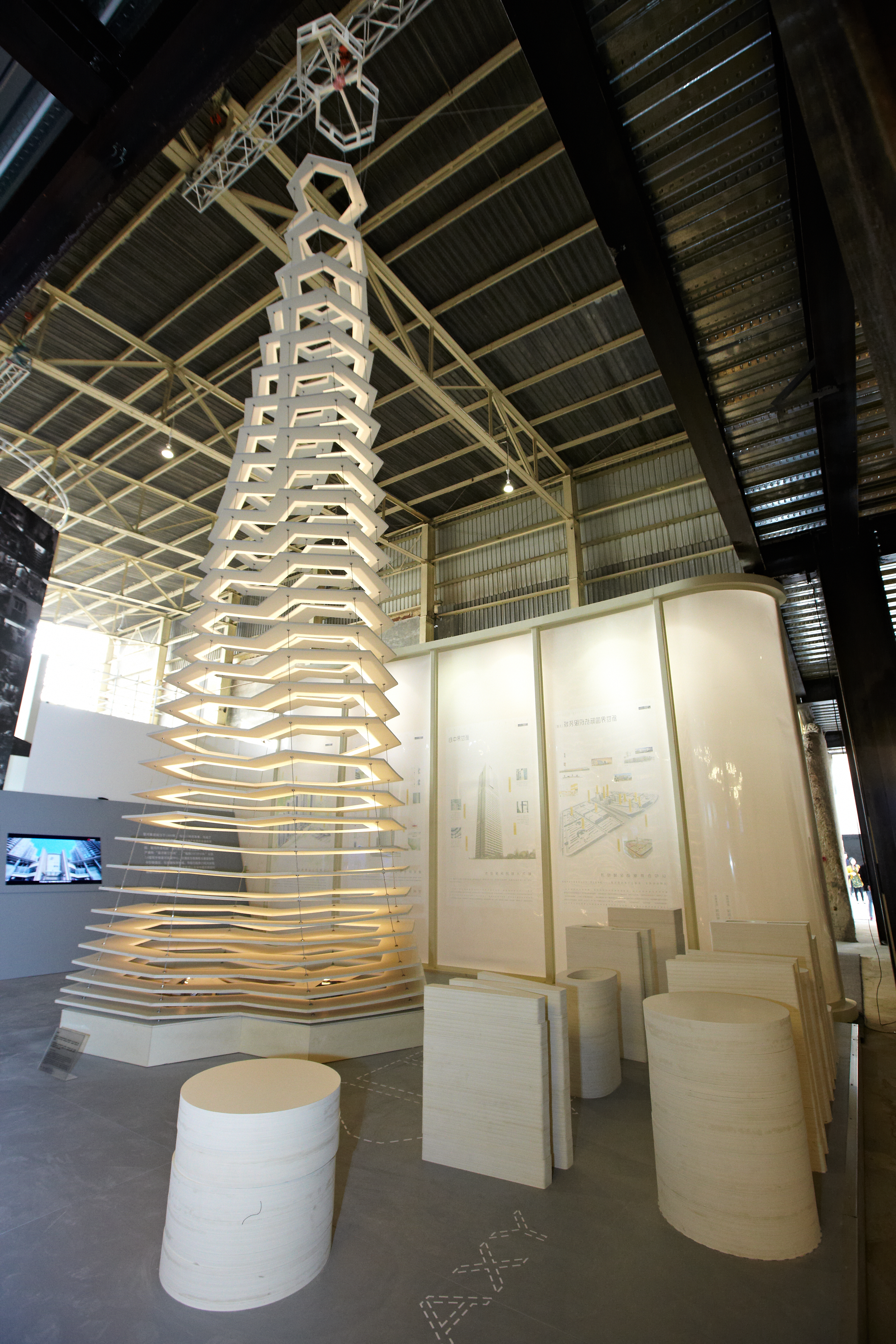 在本屆雙年展中,星河集團(tuán)通過堆疊星河雙螺絲造型,最終落地成十幾米高的星河塔,雙螺絲造型,意味著穩(wěn)定的六邊形,類似蜂巢,意味著兢兢業(yè)業(yè)的團(tuán)結(jié)。它象征了在歲月的積累與能量的匯聚。而這座塔,也象征了文化匯聚的過程:每一個(gè)被遺落的邊緣文化,都會(huì)因?yàn)槿藗兊闹饾u關(guān)注,慢慢匯聚,從而步入主流成為城市不可或缺的精神養(yǎng)料。