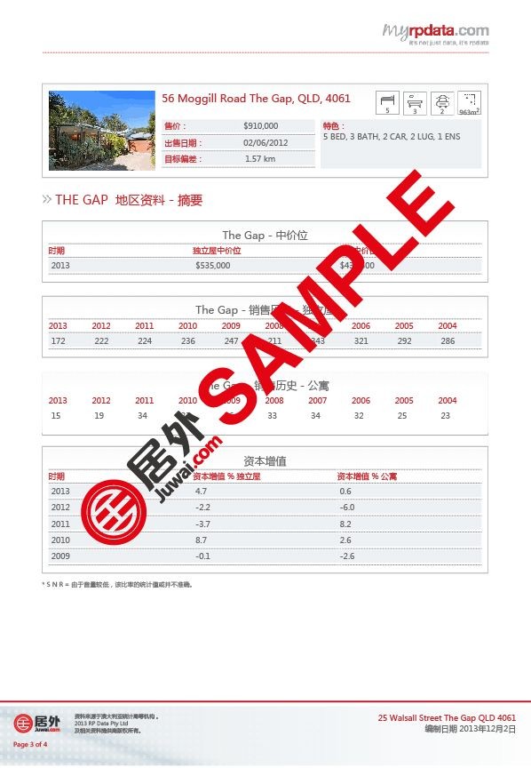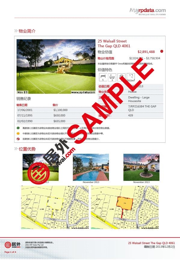 該報(bào)告為有意在澳大利亞置業(yè)的中國買家提供極具價(jià)值的房產(chǎn)信息,助其做出更明智更博識(shí)的投資決定。買家只要登陸居外網(wǎng)澳大利亞房源頁,選取任何一個(gè)房源,即可免費(fèi)獲得該房源的詳細(xì)中文報(bào)告。報(bào)告涵蓋該房產(chǎn)的銷售歷史、小區(qū)銷售情況、區(qū)內(nèi)人口面貌、家庭收入和結(jié)構(gòu)分析、土地和房價(jià)價(jià)值評(píng)估。報(bào)告中所引述的數(shù)據(jù)均來自澳大利亞統(tǒng)計(jì)局等政府權(quán)威機(jī)構(gòu)。